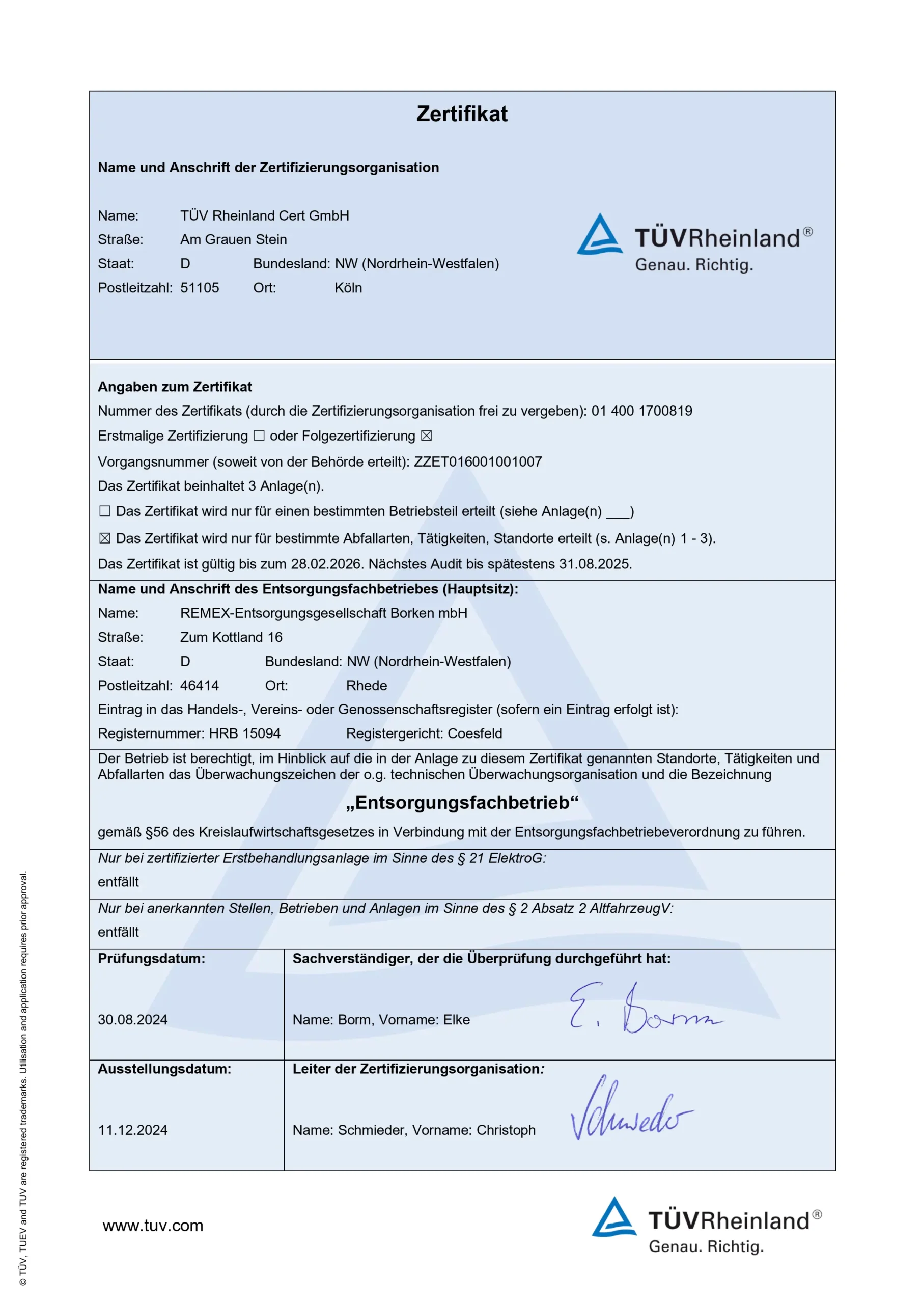 Zertifizierungen wie vom TÜV Rheinland bestätigen unseren hohen Anspruch an Qualität, Sicherheit und Umweltschutz. Denn wer aufhört, besser zu werden, hat aufgehört, gut zu sein.